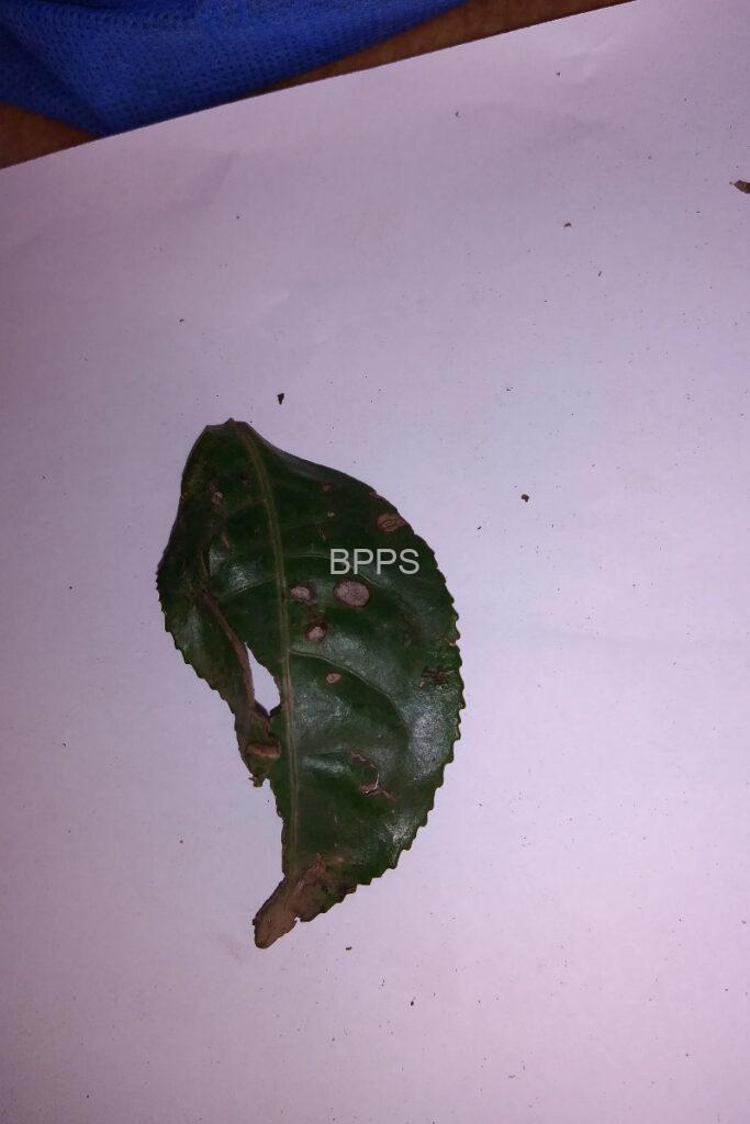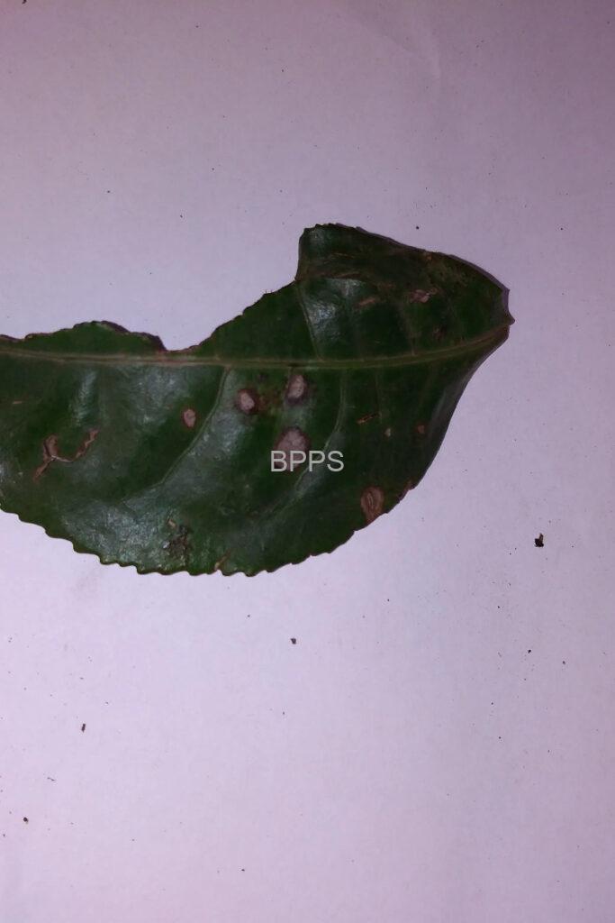 【识别要点】 危害茶树叶片,病斑半圆形或不规则形,分界明显,一般在叶尖、叶缘开始产生水渍状黄褐色小点,扩展后病斑褐色变为焦黄色,最后为灰白色。 但受主脉限制常表现为半叶病斑,后期病斑表面散生许多黑色细小粒点。