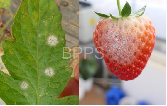 识别小窍门:瓜类染病会在叶面或叶背产生白色近圆形小粉斑,逐步扩大为不规则白粉状霉斑;草莓果发病会长出薄薄的白色菌丝层;辣椒在叶背发病明显,后期呈现密布的白色粉状物。