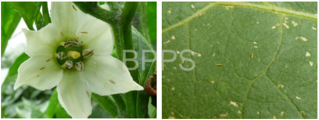 8.蓟马:为害多种蔬菜的花、嫩梢、叶片等部位,致叶片出现银白色斑痕、花朵褐变畸形,严重时导致落花落果。