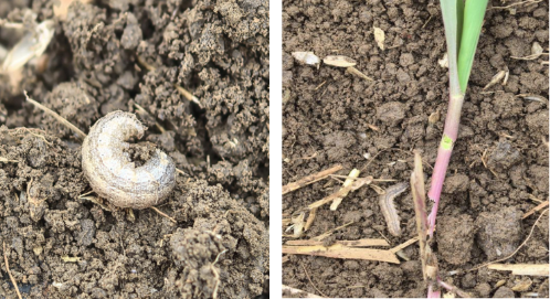 为害特点:幼虫咬食刚出的嫩叶,形成孔洞。2~3叶期,咬食玉米茎基部,把幼苗从根部咬断死亡;3~6叶期,蛀食玉米茎基部形成3~4毫米孔洞,导致玉米心叶萎蔫枯死;7~10叶期,咬食玉米根,造成倒伏。为害重时可造成大量缺苗,严重减产。