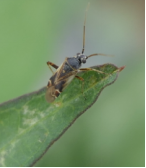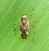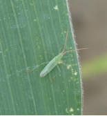 条赤须盲蝽 鲜绿色或浅绿色,身体细长,体长大约5~6 毫米,宽约1.5毫米。头略呈三角形,顶端向前突出,最突出的特征就是有接近体长的红色触角,共分为4节。前胸背面梯形,具4个暗色条纹。小盾片黄绿色,三角形。足浅绿或黄绿色,胫节末端及跗节红色、红褐色至黑褐色不等。