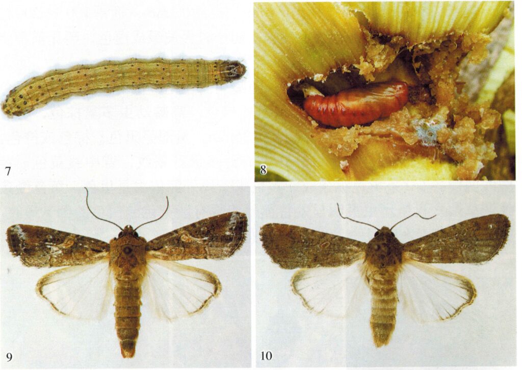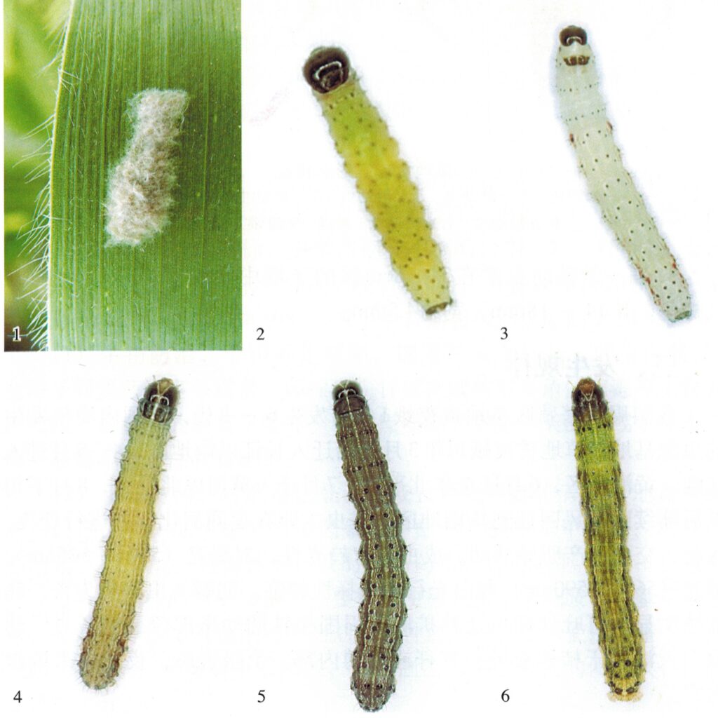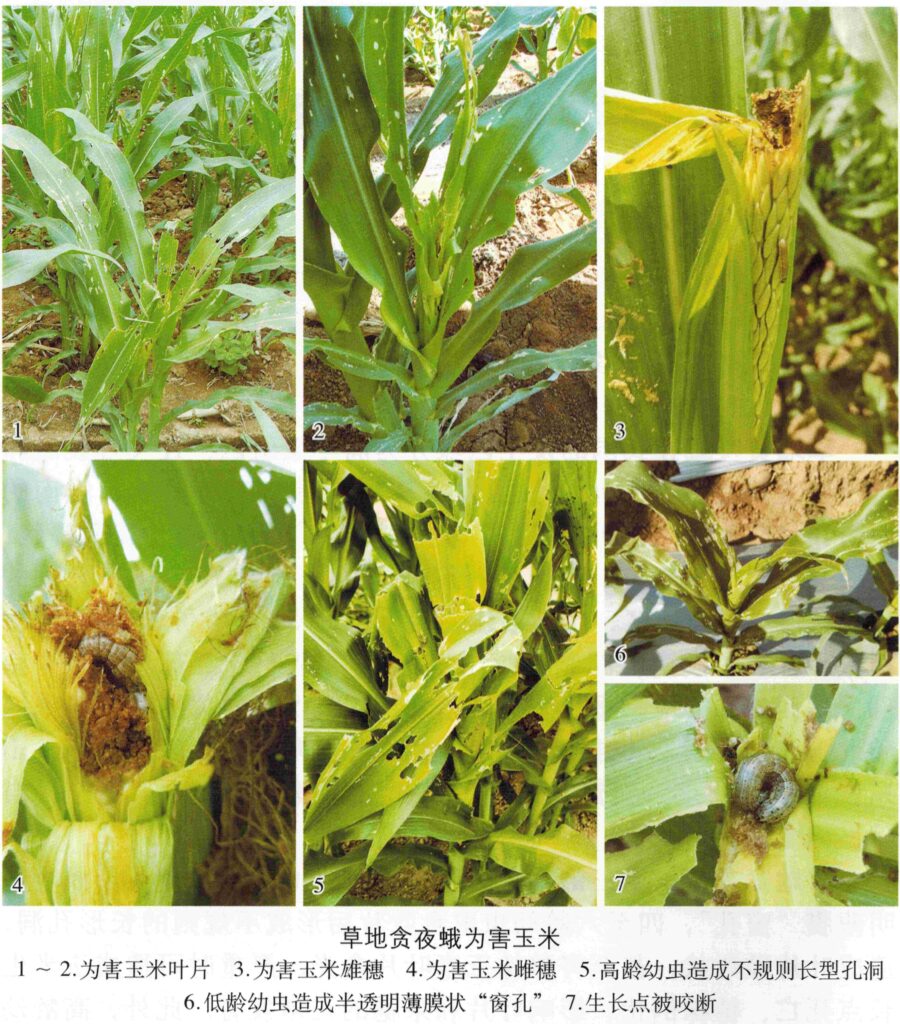 【识别要点】 在玉米上,1 – 3龄幼虫藏于叶背取食,形成半透明“窗孔” ;4 – 6龄幼虫啃食叶片致不规则长形孔洞,可吃光叶片,还会钻蛀心叶、雌雄穗,严重时植株死亡。