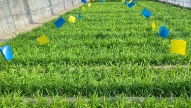 温度升高后,应注意在棚室通风口、出入口处设置40-50目防虫网,阻隔害虫传出和传入。应积极采用诱虫板、性诱捕器、迷向丝等诱控技术。黄色诱虫板可诱杀韭蛆成虫、芹菜蚜虫、番茄粉虱等,蓝板以诱杀蓟马为主,用于监测时每亩5-10张即可,用于防控害虫时每亩数量不低于30张。诱杀监测番茄潜叶蛾可用性诱捕器,每亩设置8-10个;也可以采用信息素迷向技术控制番茄潜叶蛾,每亩放置60根迷向丝或迷向管,或智能喷射型交配干扰释放器(每3-5亩1套),控制番茄潜叶蛾种群增长。