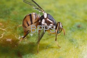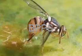 【识别要点】 橘小实蝇成虫体长7-8毫米,体色黄褐至黑,头部黄色,胸部具黑色背板及两条黄色纵纹,翅透明带褐色斑纹。其卵乳白色、梭形;幼虫蛆状、黄白色。成虫产卵于果皮下,幼虫蛀食果肉,致果实表面出现黄斑、软化腐烂并提前脱落,严重影响果实品质与产量。