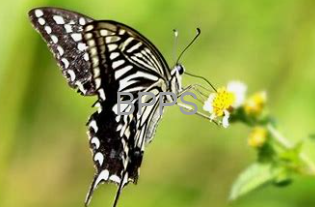 【识别要点】 柑橘凤蝶成虫色彩艳丽,翅面黑色布满黄白色斑纹;幼虫绿色,胸腹部有肉刺状突起,咬食柑橘叶片形成缺刻或孔洞,影响植株生长。