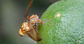 【识别要点】 橘小实蝇成虫体长7-8毫米,体色黄褐至黑,头部黄色,胸部具黑色背板及两条黄色纵纹,翅透明带褐色斑纹。其卵乳白色、梭形;幼虫蛆状、黄白色。成虫产卵于果皮下,幼虫蛀食果肉,致果实表面出现黄斑、软化腐烂并提前脱落,严重影响果实品质与产量。