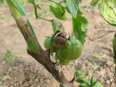 主要发病期为定植后至成株期,以茎蔓受害最重。温暖高湿、通风不良,定植后伤口多易感病。茎蔓染病,在茎基和节间附近出现油浸状斑,常溢出琥珀色胶状物,茎蔓表皮纵裂,表面散生小黑点。叶片发病多从叶缘开始产生“V”形黄褐色轮纹斑,病斑干枯后易开裂。