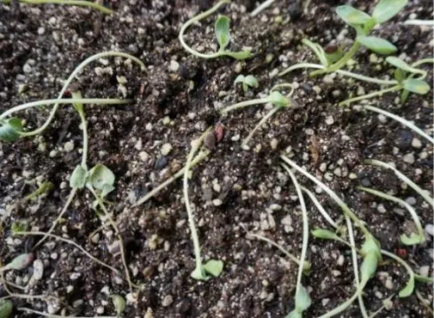 主要发病期为幼苗早期,苗床低温、高湿易发病,长期阴雨、光照不足或寒流侵袭会加重病害发生。发病后幼苗茎基部像被开水烫过,变褐、缢缩(病变而产生的局部收缩变细现象)成线状,幼苗快速倒伏死亡;湿度大时病部有白色棉絮状霉层。