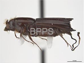 【识别要点】 脊胸天牛成虫体黑色,具光泽,前胸背板有瘤状突起,两侧各有 1 棘刺;幼虫圆筒形,乳白色。幼虫蛀食枝干,形成虫道,使树木生长受阻,易风折。