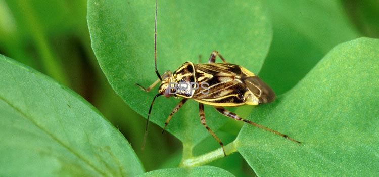 【识别要点】 牧草盲蝽成虫体长约 5 毫米,黄绿色,前胸背板有桔红色斑纹,触角 4 节。若虫体淡绿色,足细长。其以刺吸式口器吸食植物汁液,使叶片出现黄白色斑点,严重时叶片卷曲、枯萎。