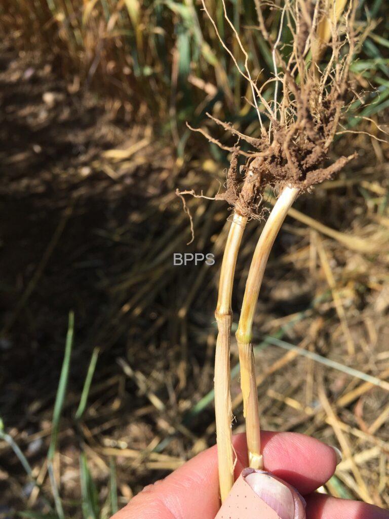 【识别要点】 根部初期现水渍状斑,后腐烂,根毛与主根表皮易脱落 ,根冠变黑黏附土粒;植株生长受阻,矮小、叶黄、分蘖少;严重时整株枯死,拔节期病株根部症状明显。