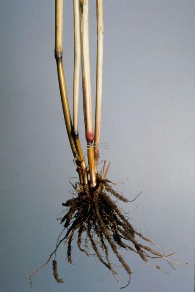 【识别要点】 根部初期现水渍状斑,后腐烂,根毛与主根表皮易脱落 ,根冠变黑黏附土粒;植株生长受阻,矮小、叶黄、分蘖少;严重时整株枯死,拔节期病株根部症状明显。
