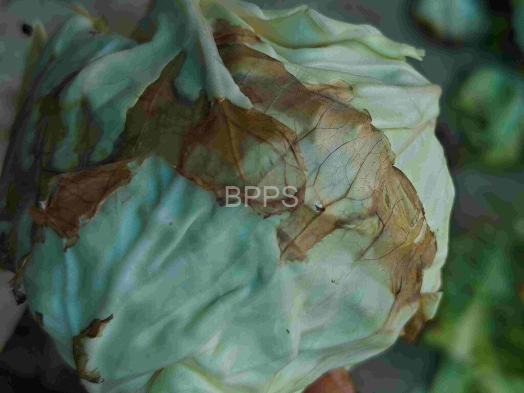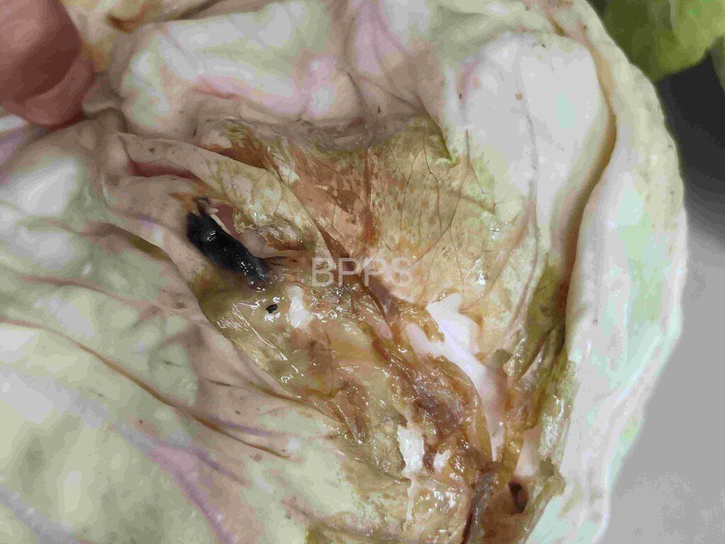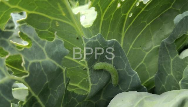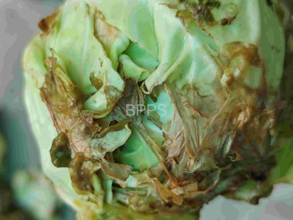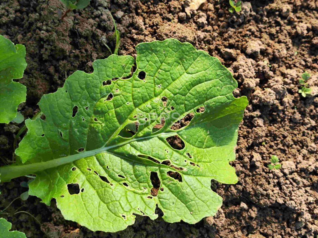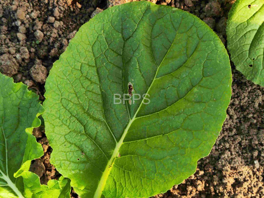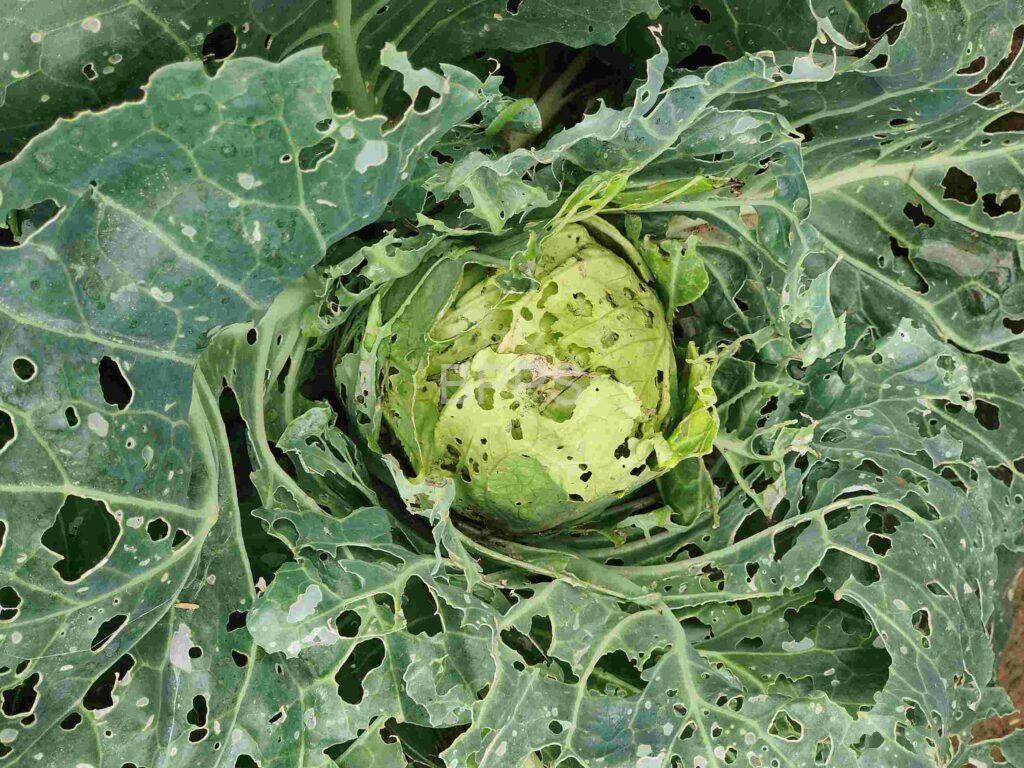 【识别要点】 鳞翅目害虫在圆白菜上为害特征明显,幼虫啃食叶片造成缺刻、孔洞,甚至整叶被食光,排泄物污染叶片,易引发软腐病。如菜青虫、小菜蛾等,严重时可蛀入叶球,影响品质。需及时采取防治措施,保护圆白菜健康生长。