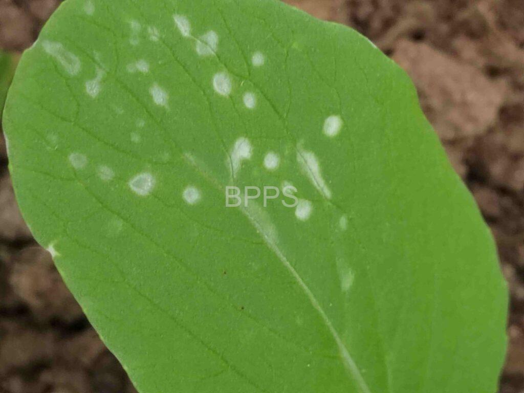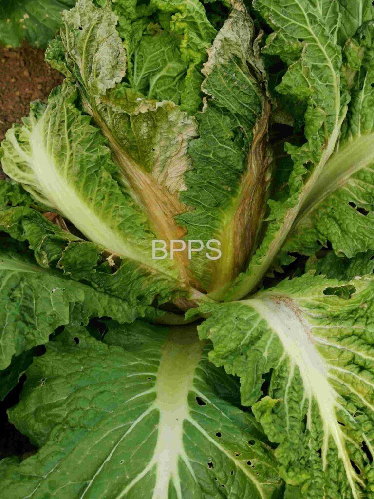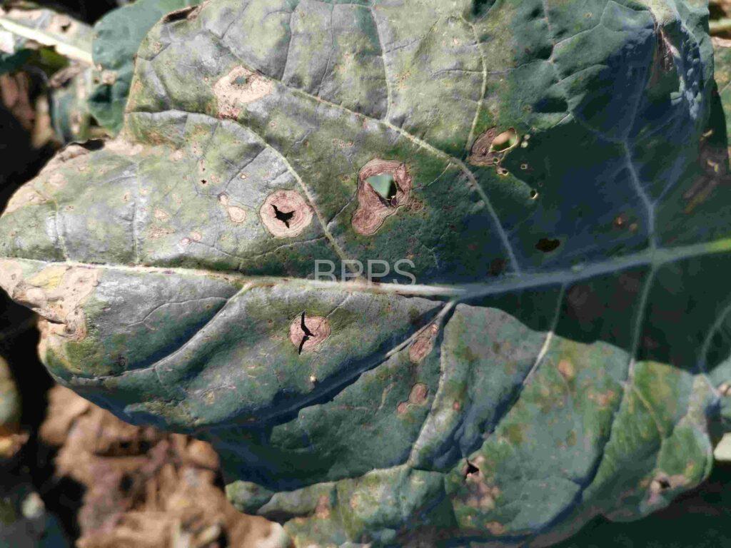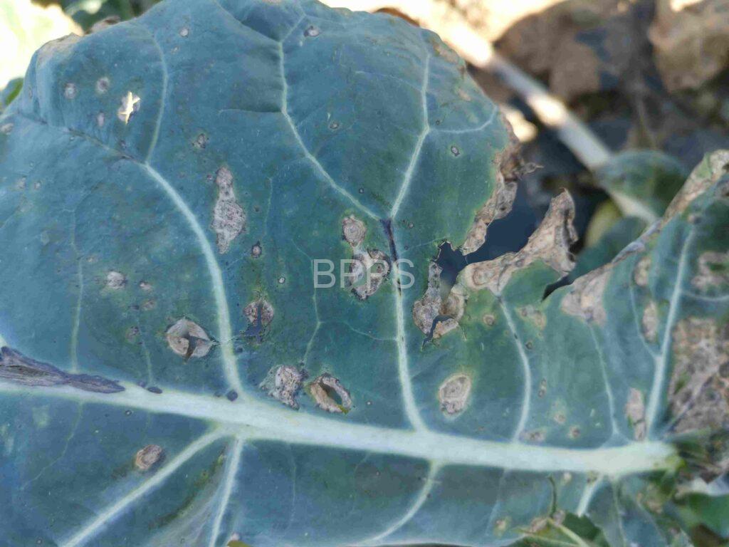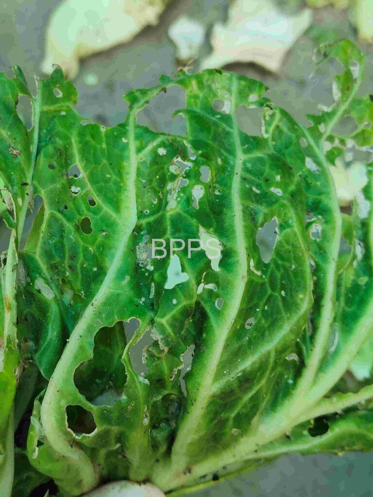 【识别要点】 鳞翅目害虫在圆白菜上为害特征明显,幼虫啃食叶片造成缺刻、孔洞,甚至整叶被食光,排泄物污染叶片,易引发软腐病。如菜青虫、小菜蛾等,严重时可蛀入叶球,影响品质。需及时采取防治措施,保护圆白菜健康生长。