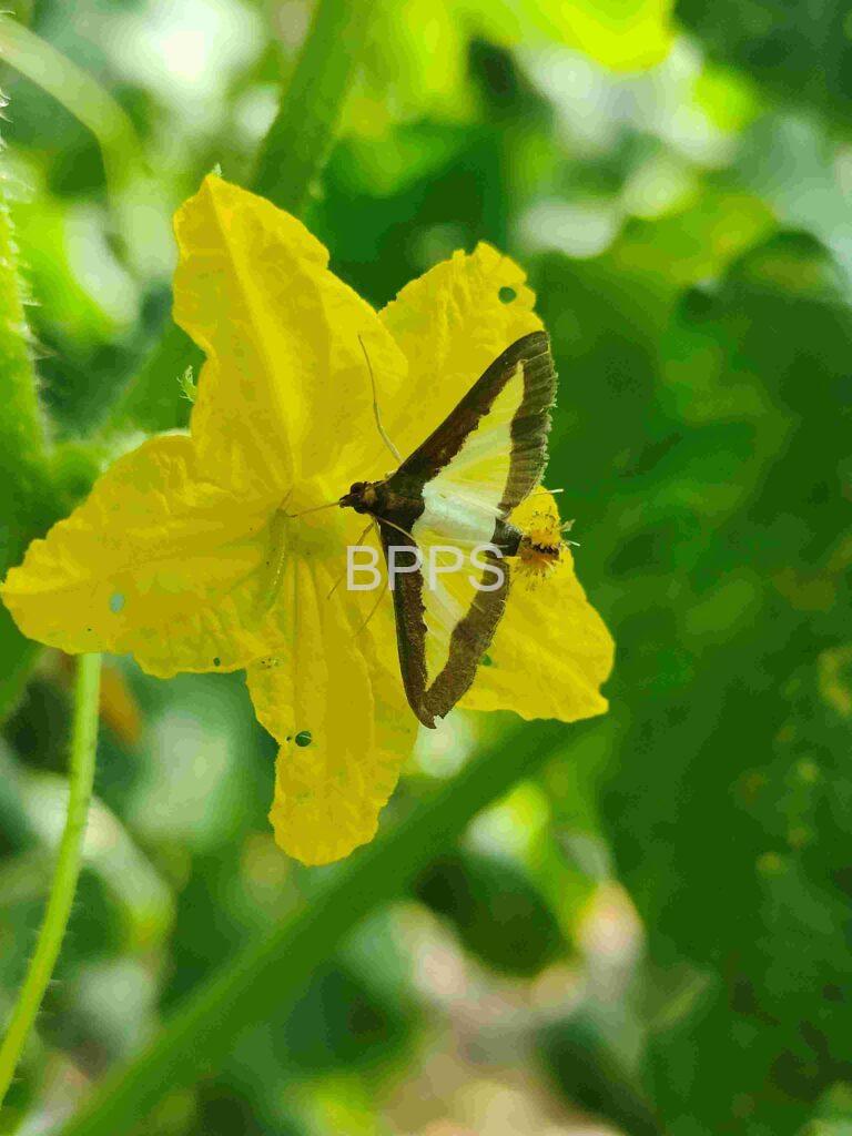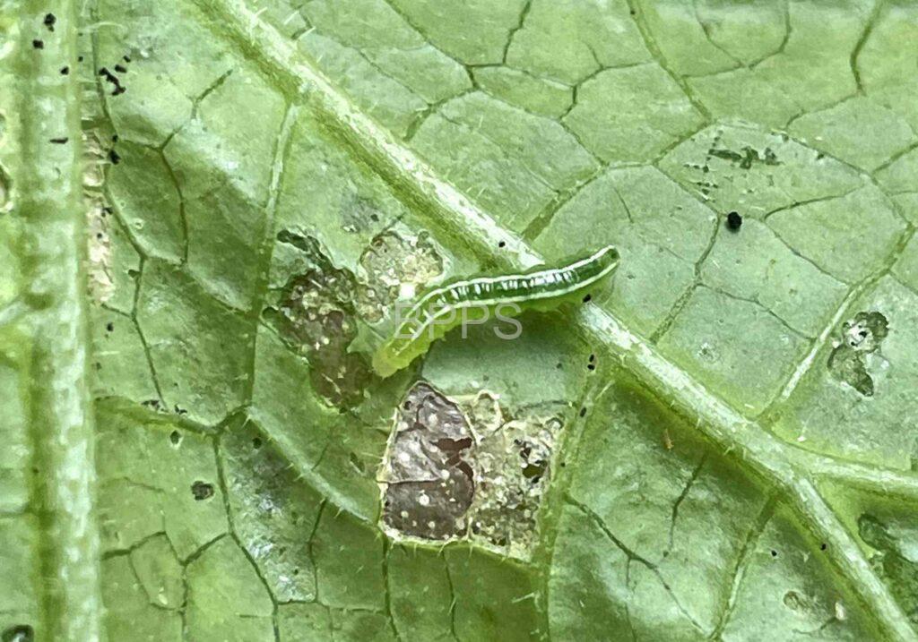 【识别要点】 幼龄幼虫在瓜类叶背取食叶肉,使叶片呈灰白斑,3龄后常将叶片左右卷起,吐丝将叶或嫩梢缀合,匿居其中取食,使叶片穿孔或缺刻,严重时仅剩叶脉。瓜类坐果后,幼虫啃食瓜果表皮,逐渐蛀入瓜内,取食皮下瓜肉。