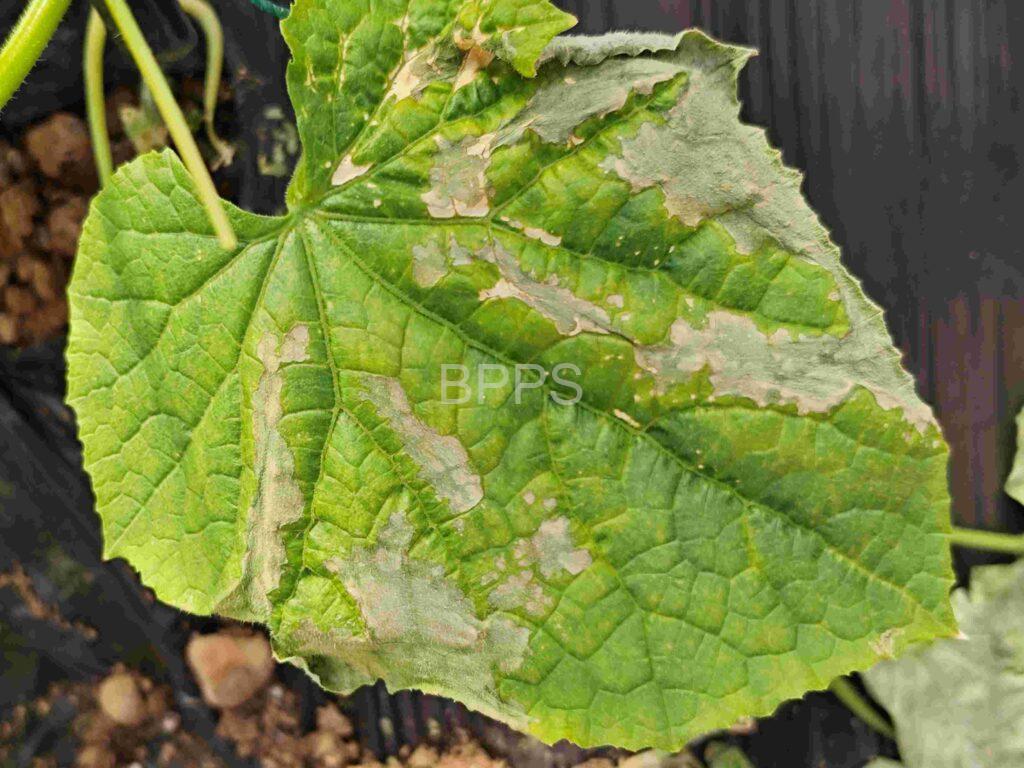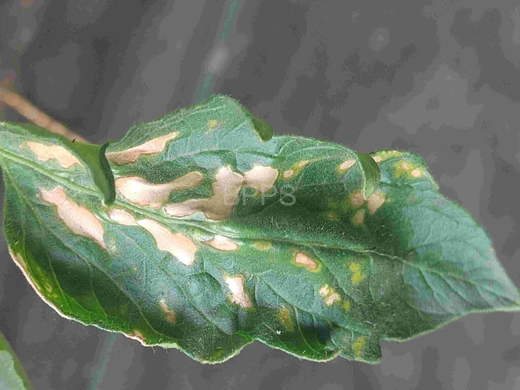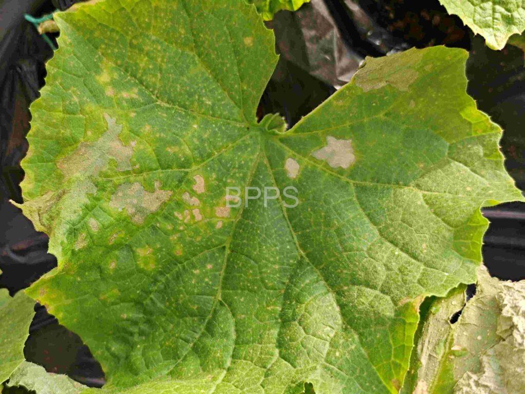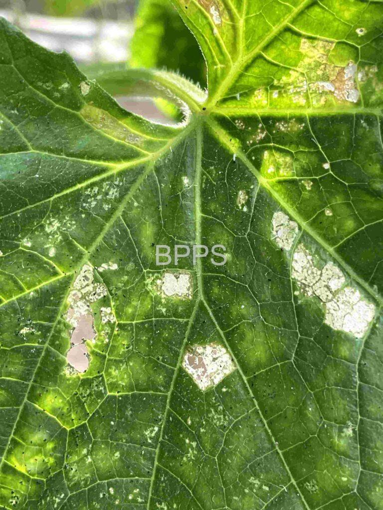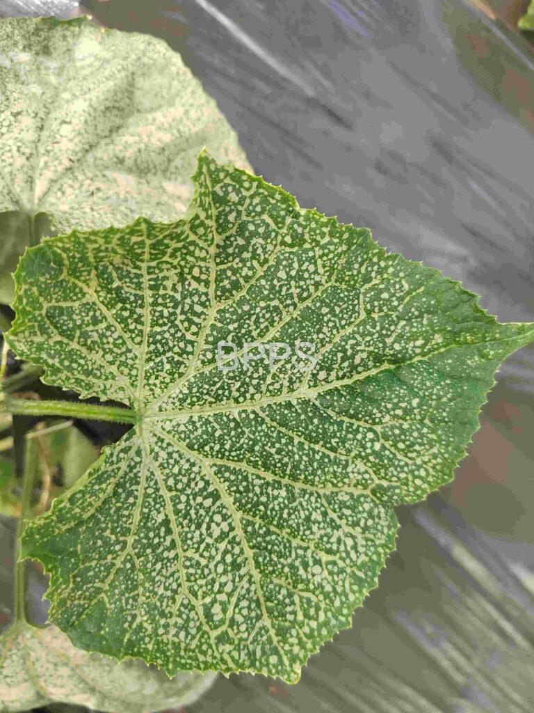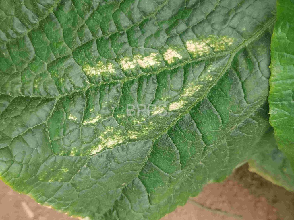 【识别要点】 初期叶片正面出现不规则的小白点或白斑,边缘不清晰,多集中在叶尖或叶缘;中期白斑扩大,形成较大的白色或黄白色斑块,叶片变薄、变脆,严重时呈透明状或水浸状;后期白斑部位坏死,叶片干枯卷曲,植株生长受阻,新叶发育不良。