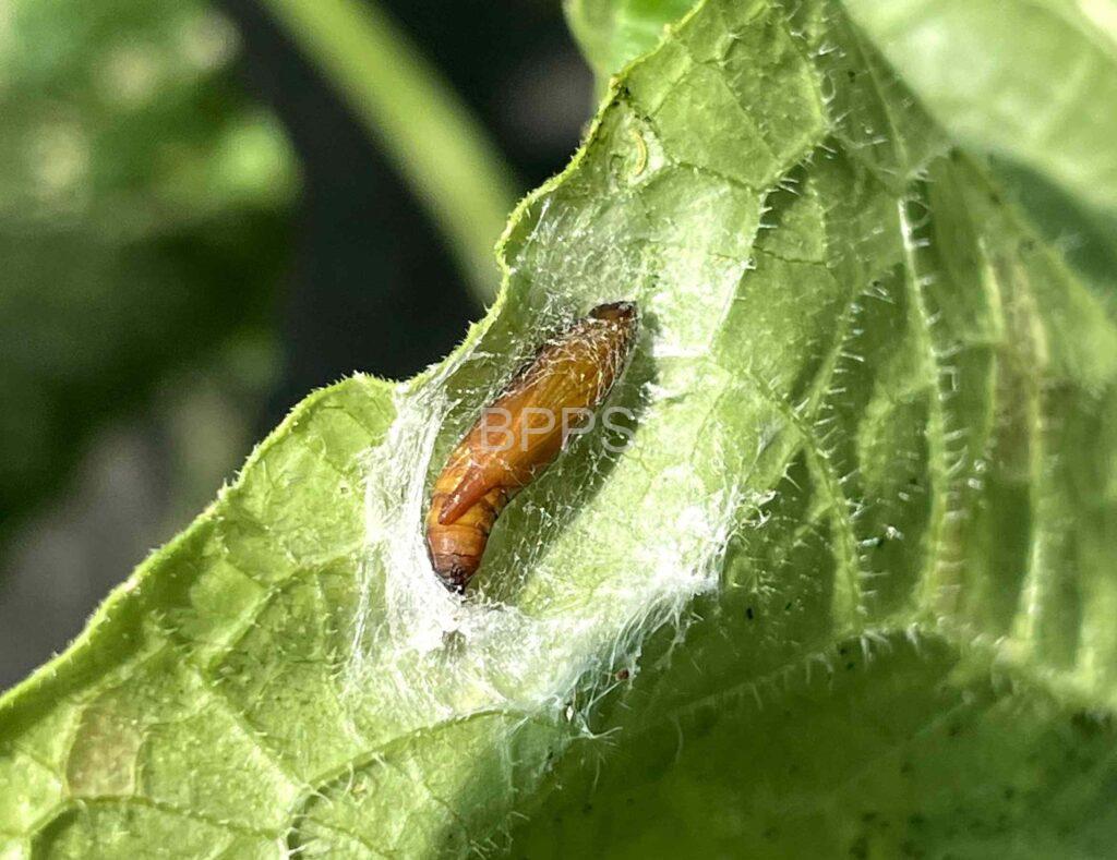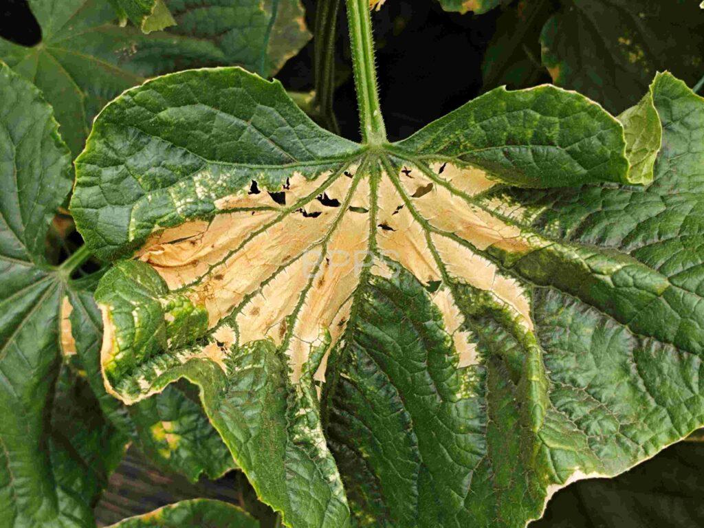 【识别要点】 幼龄幼虫在瓜类叶背取食叶肉,使叶片呈灰白斑,3龄后常将叶片左右卷起,吐丝将叶或嫩梢缀合,匿居其中取食,使叶片穿孔或缺刻,严重时仅剩叶脉。瓜类坐果后,幼虫啃食瓜果表皮,逐渐蛀入瓜内,取食皮下瓜肉。