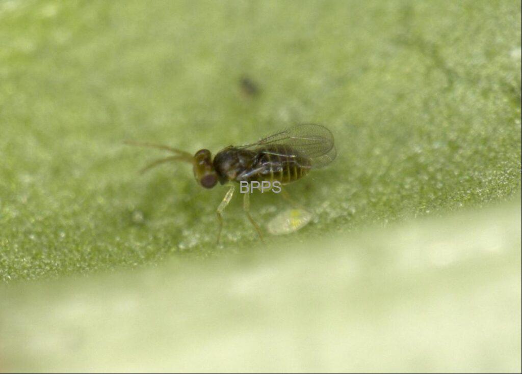 丽蚜小蜂属膜翅目、蚜小蜂科、恩蚜小蜂属,是世界广泛商业化的用于控制温室作物粉虱的寄生蜂。喜取食白粉虱二龄若虫和蛹期;对烟粉虱的若虫期和蛹期取食嗜好性相同。在其12天的预期寿命中平均可杀死95个若虫。产卵偏好于两种粉虱的3、4龄和预蛹期,在这些虫态的寄生率最高。成虫每天可产5粒卵,死亡前其产60粒卵。