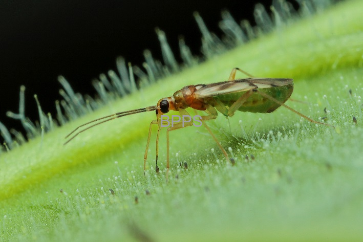 烟盲蝽属于半翅目,盲蝽科,,其食性广,可捕食粉虱、斑潜蝇以及鳞翅目昆虫的卵和初孵幼虫等农业害虫。具有捕食能力强、适应性强、活动能力强等特点,尤其对烟粉虱和温室白粉虱成虫和若虫均有很强的捕食作用。成虫和2龄以上的各龄若虫均有捕食能力。每头烟盲蝽雌成虫最天可捕食20~30头烟粉虱若虫,可捕食100粒粉虱卵,是一种利用潜力巨大的捕食性天敌。